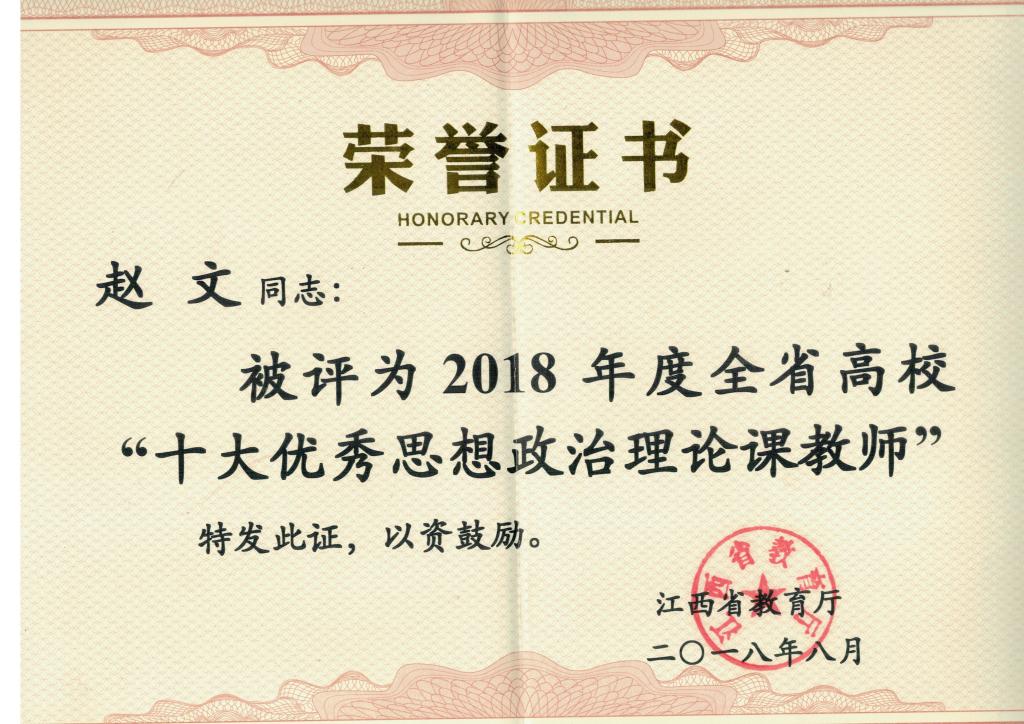 3.以课堂优化为核心开展课程建设。赵文同志参加了2017年“全国高校‘概论’课现场教学展示”活动、教育部建设学习贯彻党的十九大精神“名师示范课堂”和江西省“特色示范课程”活动;参加2016年江西省高校思想政治理论课优秀教案评选活动并获二等奖。