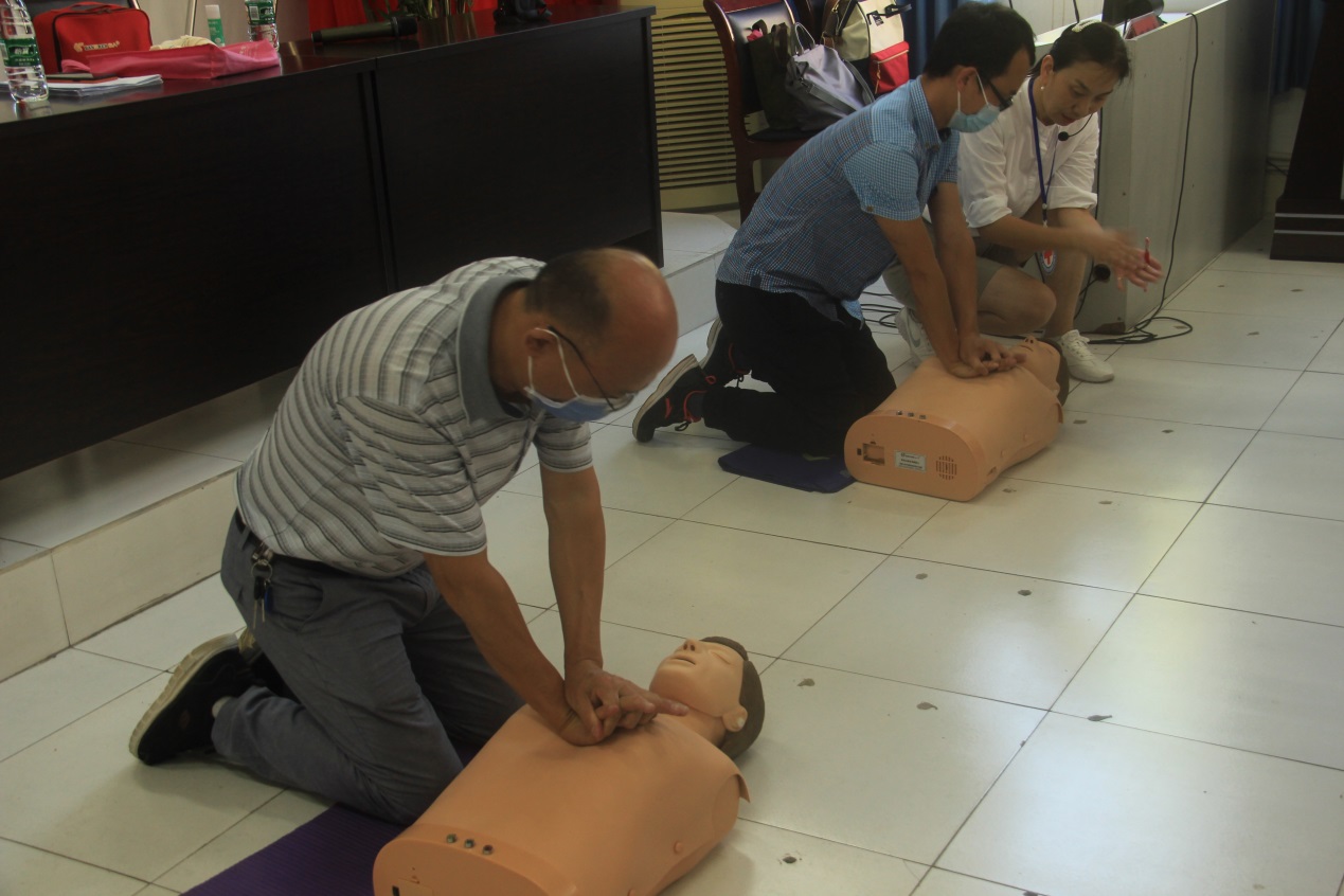 培训分为理论教学和实践操作两个部分。在理论教学部分,培训老师以生动的实例讲授了红十字运动的起、救护概念、心肺复苏术、创伤救护等课程,并向教职演示了心肺复苏术、人工呼吸法、小孩气道异物梗塞时的紧急救护、创伤救护等方面进行了深入浅出的讲解。最后,在培训人员的指导下,教职工依次进行了实践操作演练。