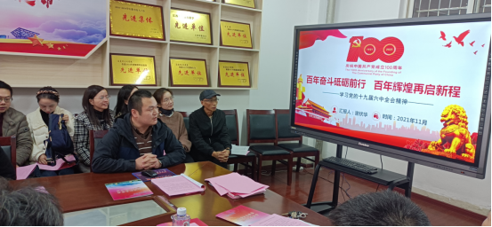 会上,教工一支部书记余建明以《指引百年大党领航民族复兴——党的十九届六中全会精神解读》为题,从全会召开的重大意义、第三个历史决议的重大意义、全会精神的精髓要义等方面为大家全面深刻地解读了全会精神。教工二支部支委谢伏华博士以《百年奋斗砥砺前行 百年辉煌再启新程》为题向与会人员详细解读了《中共中央关于党的百年奋斗重大成就和历史经验的决议》内容及精神。