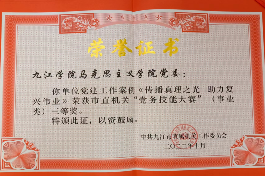 为深入贯彻落实习近平总书记关于机关党建重要论述,认真总结、提炼、推广机关党建工作好案例、好经验、好做法,大力营造“抓党建、学业务、比技能”的浓厚氛围,今年5月份,市直机关工委在市直机关单位中开展了“高质量打造模范机关,争创第一等党务工作”党务技能大赛。我院党建工作案例《传播真理之光 助力复兴伟业》经学校推荐,组委会层层筛选,最终被评定三等奖。