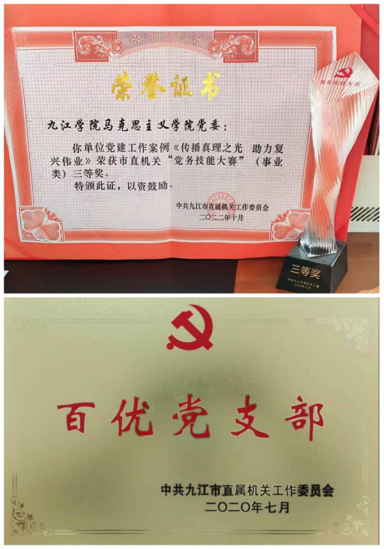 学院持续优化党支部设置,依托行政科室和教研室建立党支部,不断加强党建引领;紧扣思政课教育教学中心任务,充分发挥党支部把准方向、促进发展、狠抓落实的战斗堡垒作用,大力推动党建与教学科研工作融合发展;充分发挥学院教师党员在人才培养、科学研究、社会服务等方面的先锋模范作用。近年来,学院荣获“九江市百优支部”“九江市党务技能大赛三等奖”“校优秀基层党组织”“校党建工作样板支部”“校主题党日活动一等奖”等荣誉称号。