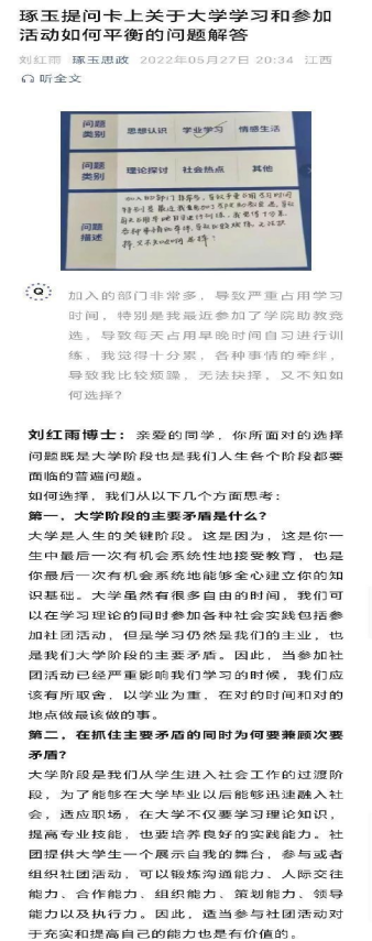 答·“青春之问”。通过微信公众号和“青春之问”专用邮箱收集学生中普遍存在的思想困惑、学习问题等,疏导学生关于学习、生活、社交、恋爱等方面的“小疑虑”及“小障碍”。