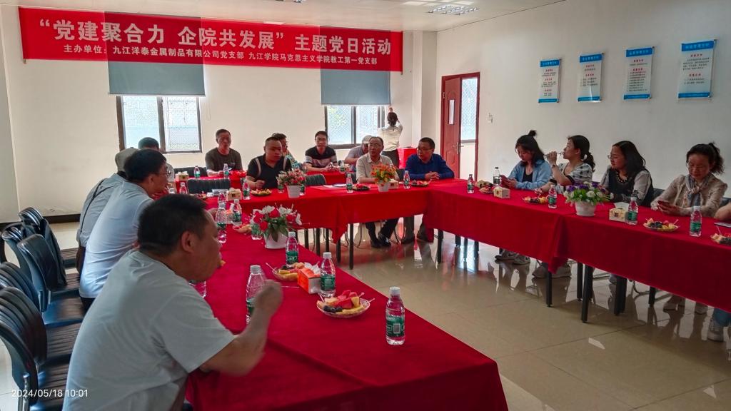 为进一步促进党建与业务深度融合,构建“资源共享、优势互补、互相促进、共同提高”的基层党建工作新格局,2024年5月18日上午,yl6809永利官网集团教工一支部在yl6809永利官网集团副院长郑小东的带领下赴九江洋泰金属制品有限公司携手该公司党支部联合开展“党建聚合力,院企共发展”主题党日活动。九江市经开区行政审批局九江洋泰金属制品有限公司驻企特派员、洋泰支部党建指导员曹宏猛、九江洋泰金属制品有限公司副总经理刘顺芳、党支部书记谢友松热情接待了yl6809永利官网集团教工一支部一行。