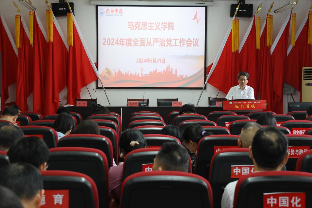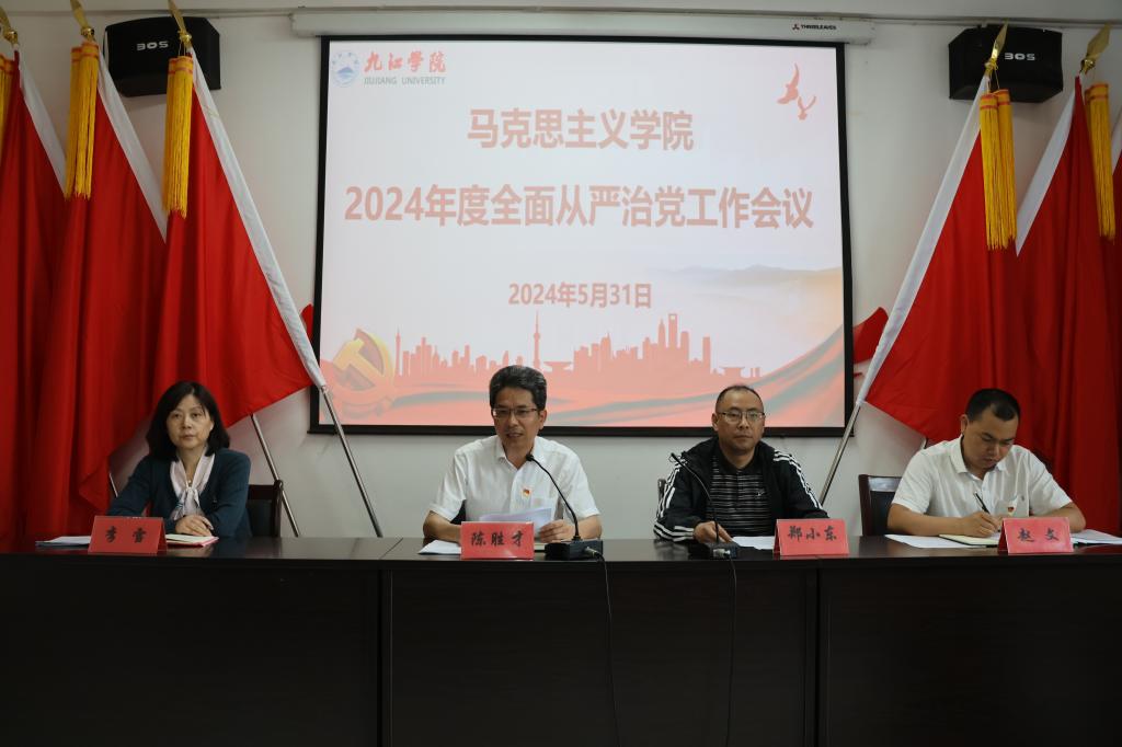 陈胜才总结了学院2023年度全面从严治党工作,并从四个方面对学院2024年全面从严治党重点工作作了部署,一是要坚定政治方向,深学细悟习近平总书记关于党的自我革命的重要思想。二是要强化政治引领,牢固树立马院姓马的政治定位和政治属性,推动全面从严治党向纵深发展。三是扎实深入开展党纪学习教育,充分发挥思政课教师正能量,树牢纪律规矩意识,做弘扬正气的倡导者。四是要严格落实意识形态工作责任制,着力提升思政课育人实效。他希望全体教师明确思政课守正创新的方向和着力点,持续推动党建和学院中心工作深融互促,充分发挥全面从严治党引领保障作用,为学校学院高质量发展做出更大贡献。