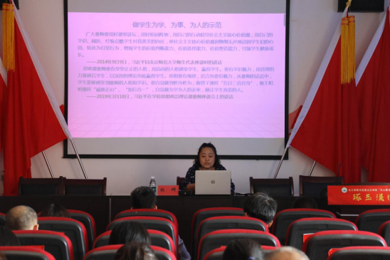 会上,刘妍老师以《做“四有”好老师》为题,从“教师、师德、师风解读”、“师德内涵”、“师德的践行”、“不忘初心 立德树人”这四个方面,结合自身从教24年的师德践行,系统梳理阐释了习近平总书记对新时代教师的期望和要求,以及如何在教育岗位上践行“四有”好老师。刘妍老师的宣讲情感真挚、案例生动,引发了与会教师的共鸣,大家深受触动。