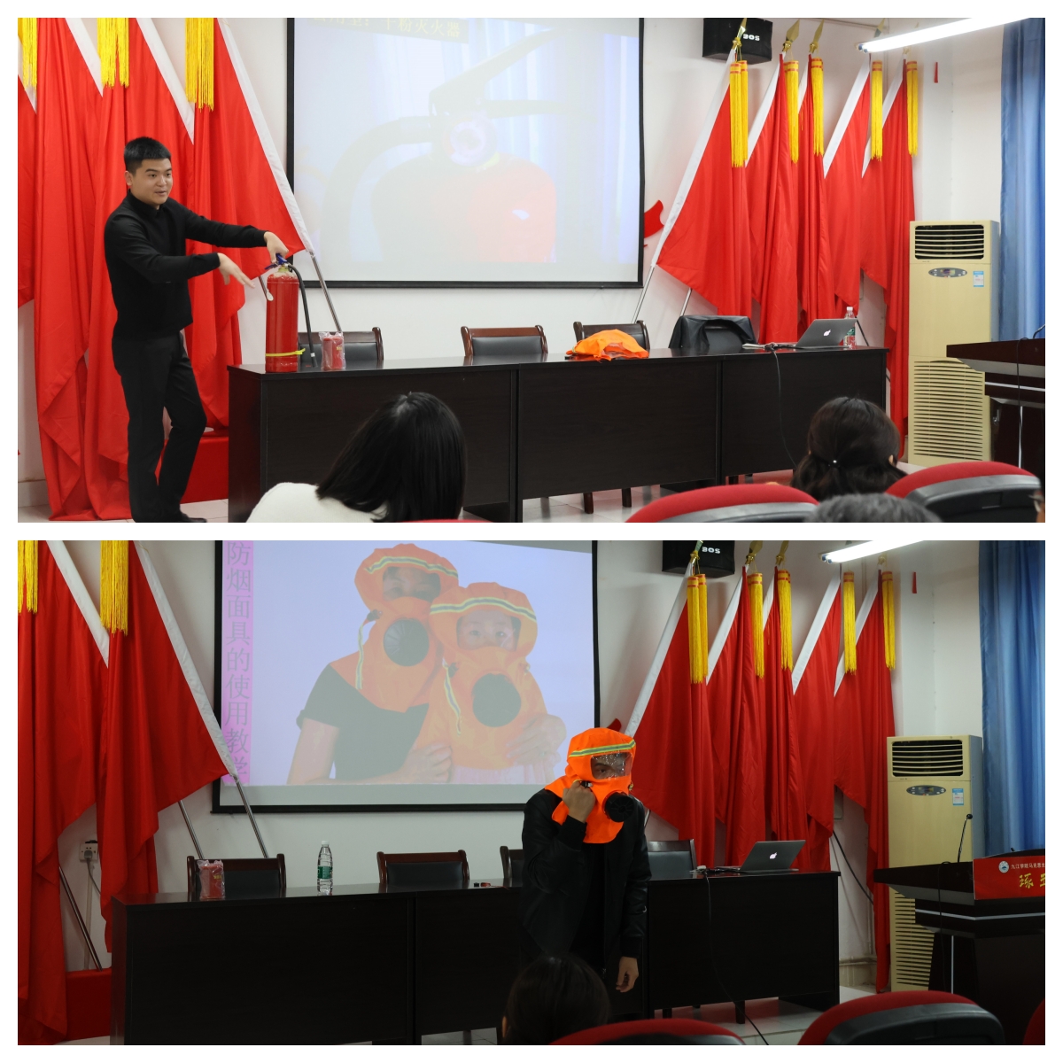 讲座伊始,丁鹤讲师结合近期国内突发的真实事故案例,以视频和图片的方式进行详细讲解,引用案例发人深省,让每位教师深刻感受到火灾的危害和熟练掌握消防知识的重要性。随后,他从如何预防消防事故,单位、家中、私家车上应该必备哪些消防器械,怎样使用灭火器等消防器材,不同火情使用什么种类的灭火器,发生事故时如何消除火灾和有效逃生等安全知识,对火灾现场的应急和预防进行科普,并现场演示了灭火器和防烟面具的正确使用方法。