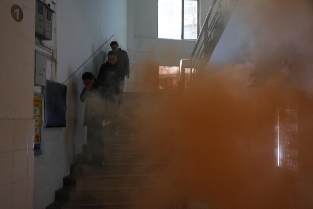 接着在一阵急促的警报声响后,办公楼开始浓烟弥漫。听到警报声,全体教师按照弯腰、靠墙、捂口鼻等要领,沿着安全疏散的标识有序撤离到安全地带。