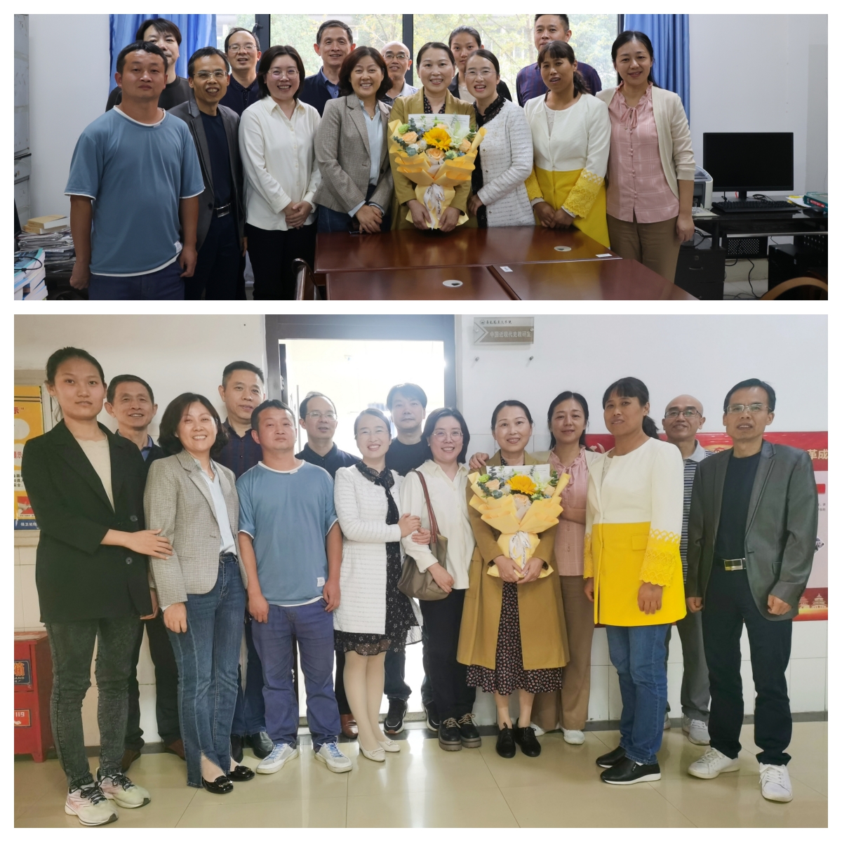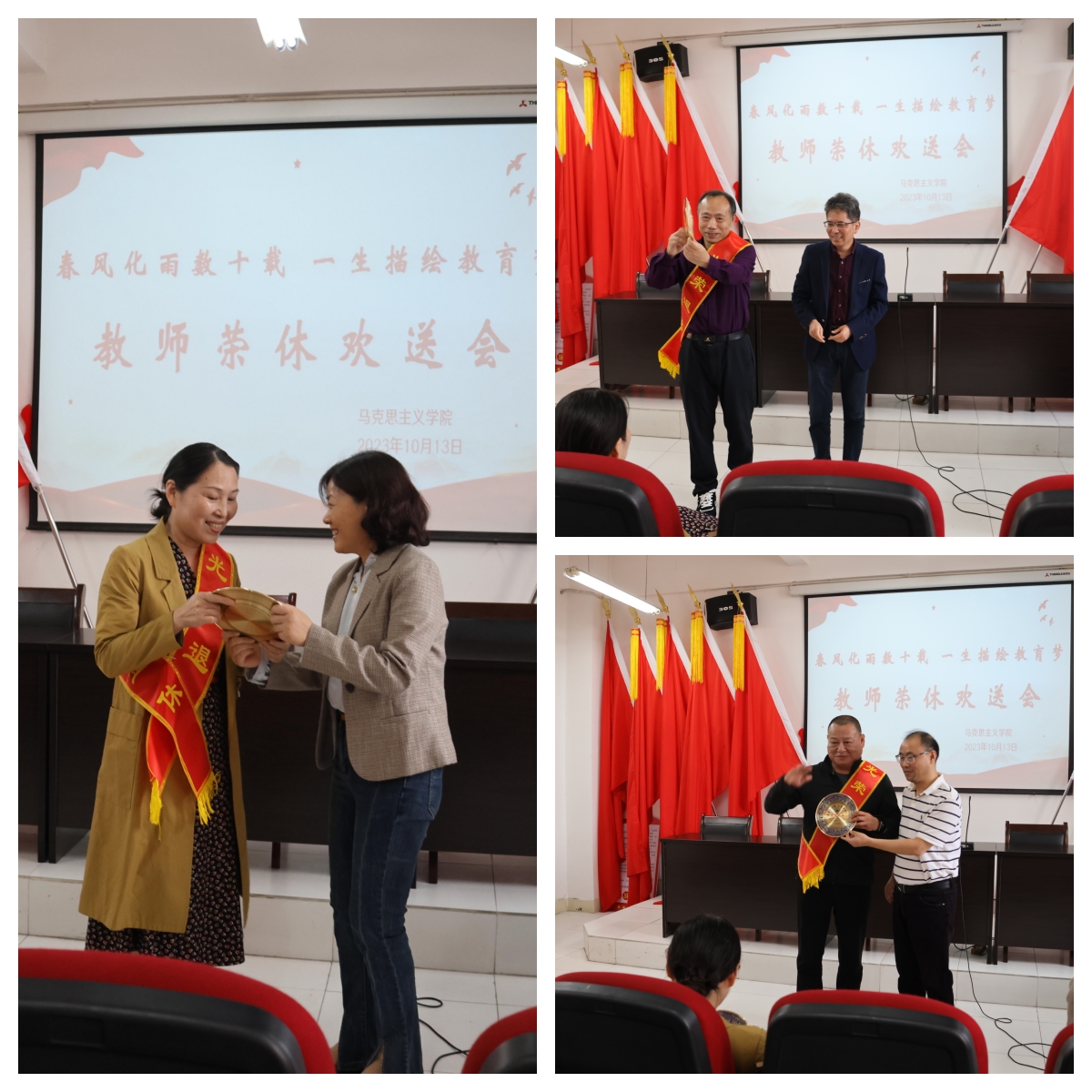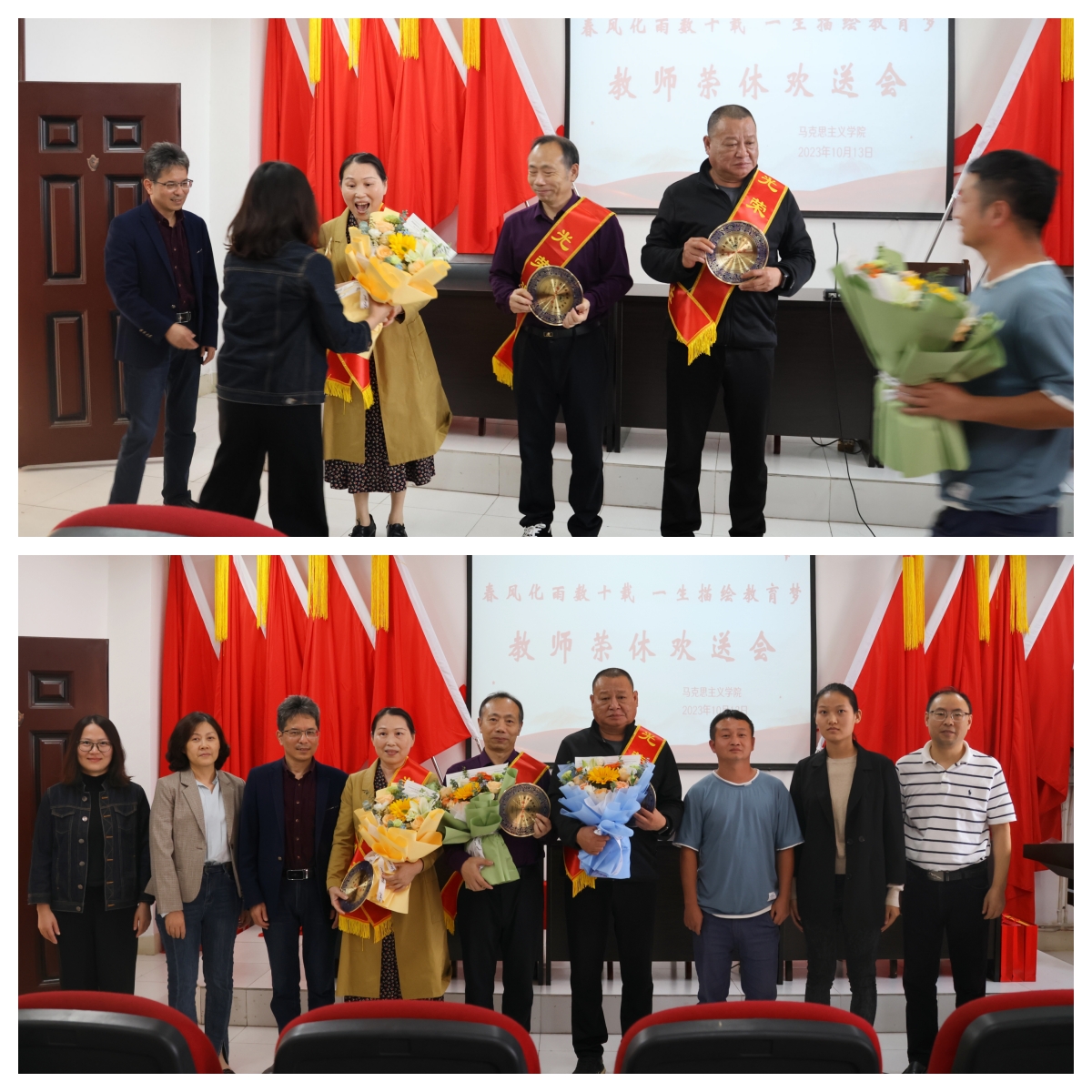 岁月映初心,薪火永相传。院长陈胜才、副院长郑小东、党委副书记李雪为他们颁发荣休纪念品。新入职教师段谟发博士、刘系周博士、谢明利老师为他们献上鲜花,表示要以光荣退休的前辈们为榜样,奋发进取,砥砺前行。
