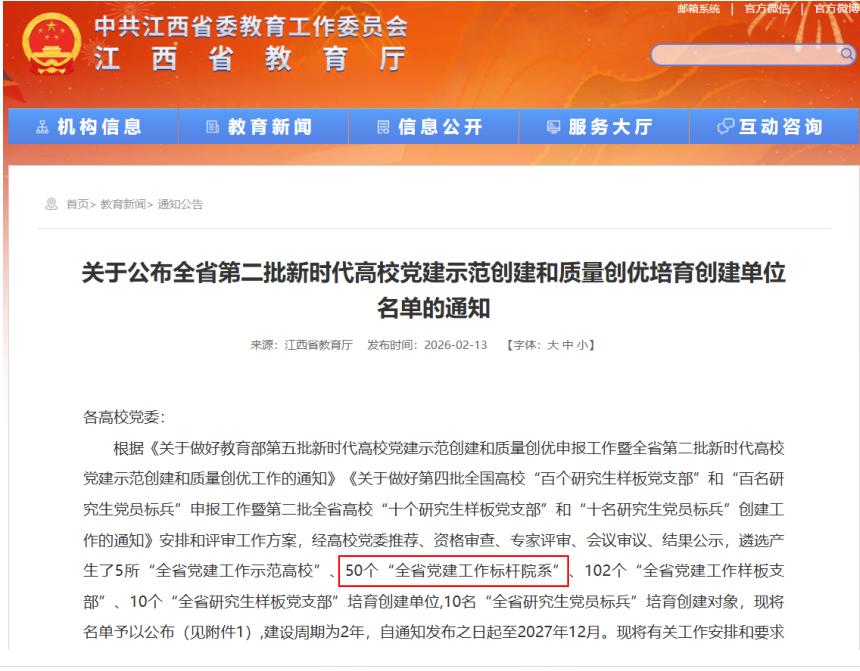 日前,中共江西省委教育工委正式印发《关于公布全省第二批新时代高校党建示范创建和质量创优培育创建单位名单的通知》,yl6809永利官网集团成功入选“省级党建工作标杆院系”培育创建单位。此次入选既体现了省委教育工委对学院党建工作的高度肯定,也集中展现了学院在推动党建与育人深度融合方面的扎实探索和阶段性成果。