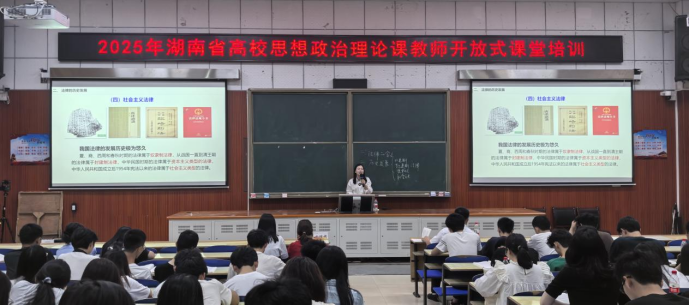 为深入推进习近平新时代中国特色社会主义思想进教材、进课堂、进头脑,守正创新推动思政课建设内涵式发展,加强高校思政课教师队伍建设,提升思政课教学质量,推进思政课改革创新,2025年5月23日下午,由湖南省教育厅主办的2025年湖南省高校思想政治理论课教师开放式课堂《思想道德与法治》专场培训(第六期)在湖南文理学院举行,我院德育教研室主任古维娟副教授受邀做教学展示,来自湖南省各高校的130多位思政课老师参加。活动由湖南文理学院yl6809永利官网集团院长周忠华教授主持。