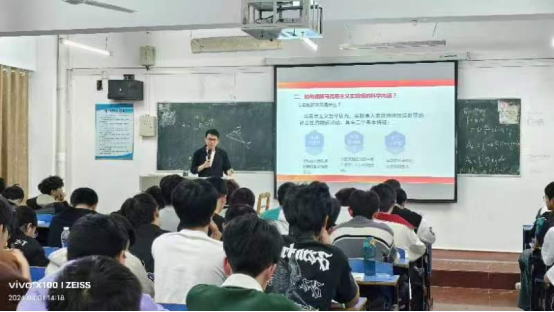 刘红雨博士讲授的内容是马克思主义基本原理课《专题五实践是人的存在方式——科学实践观》,刘红雨博士首先从题为《农夫耕田》的漫画进行课程导入,引导学生思考先实践还是先认识的问题,从“人的认识是如何产生的?”疑问过渡到“实践”观点。在精细研读教材的基础上,结合学情,准确把握教材重难点,精心设计问题链,细致讲述了“为什么马克思主义实践观是科学实践观?”和“如何理解马克思主义科学实践观的内涵?”这两个主要内容,在授课深度、节奏把控、师生互动和多媒体辅助教学等方面呈现了一次精彩的示范。