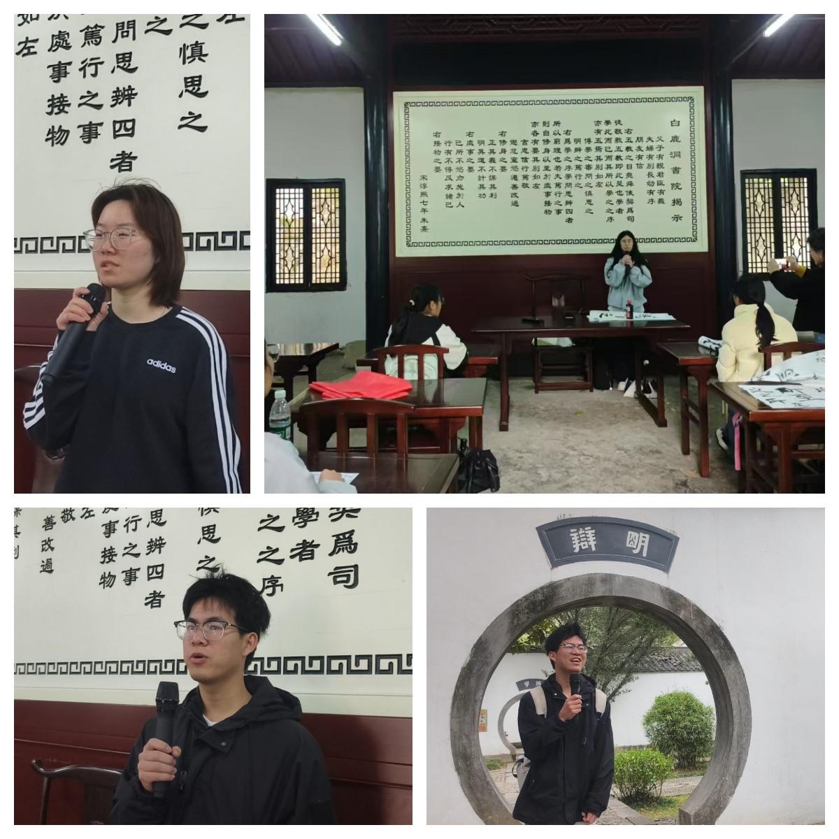 活动期间,师生们就马克思主义文化观与传统文化的结合这一主题,踊跃发言,各抒己见。大家聚焦“父子有亲,君臣有义,夫妇有别,长幼有序,朋友有信”这类传统道德观念,紧密联系马克思主义关于人的全面发展理论、社会关系学说,以及 “两个结合” 的重要论述展开讨论。在讨论过程中,师生们深入思考,在当代社会多元复杂的环境下,如何巧妙搭建起传统与现代之间的桥梁,让古老的传统道德观念在新时代焕发出全新活力,使其与马克思主义理论相互补充、相得益彰。这种沉浸式的交流体验,让学生们更加透彻地理解了马克思主义理论的内涵与价值,增强了文化自信。学生代表们分享道,“参观白鹿洞书院后,我对社会主义核心价值观有了更为深刻的理解,它正是马克思主义基本原理同中华优秀传统文化相结合的生动体现。”“书院传承千年的精神,时刻教诲着我们要注重修身养性,严于律己,努力营造和谐美好的人际关系与社会氛围。”“我们大学生要主动担当起传承与弘扬中华优秀传统文化的重任,积极投身祖国建设,为实现中华民族伟大复兴贡献力量。”