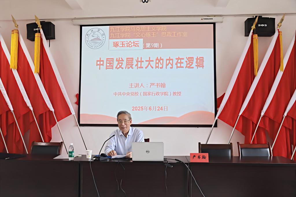 6月24日,yl6809永利官网集团“文心琢玉”思政工作室第九期、第十期“琢玉论坛”在香远楼212会议室举行。中共中央党校(国家行政学院)严书翰教授、中国社会科学院樊欣研究员受邀分别作题为:《中国发展壮大的内在逻辑》《中国共产党人百年来跳出历史周期率的探索及其重大意义》学术报告,报告会由yl6809永利官网集团院长陈胜才主持,学院全体教师参加报告会。