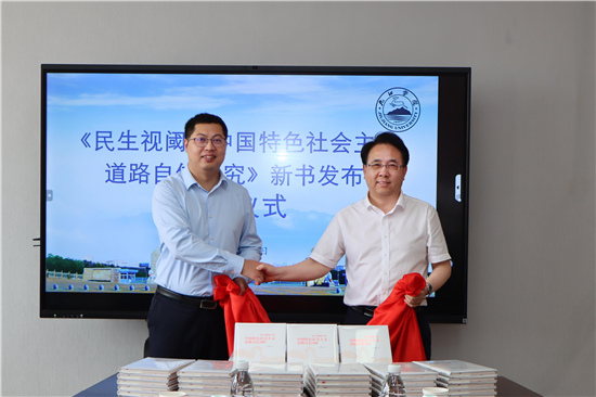 在热烈掌声中,李明斌与张芝雄共同为新书揭幕,标志着《民生视阈下的中国特色社会主义道路自信研究》正式面世。